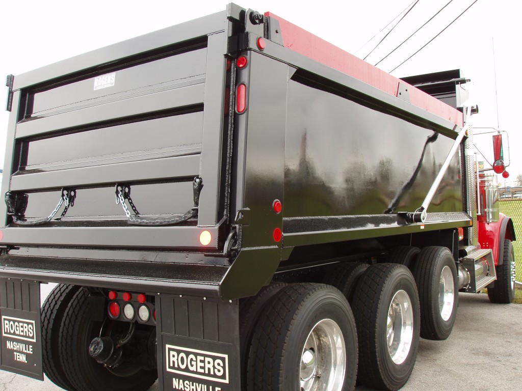 The ROGERS STEALTH is a structured, unitized dump body built of 3/16” AR plate sides, front, and tailgate. The floor is 1/4” AR steel with no cross members. The absence of side posts allows the side panels to flex when absorbing heavy loads then resume its original form. The smooth sides and bottom make cleaning much faster and easier. Additionally, the large unobstructed side surface allows for good advertising opportunities. Standard features include 16 foot body length, 50-inch sides and 56-inch straight or sloping tailgate, electric tarp assembly, 8-inch push-bumper, and air-latch tailgate with spreader chains. The tailgate hinges are ROGERS standard pins and bushings with grease fittings.
